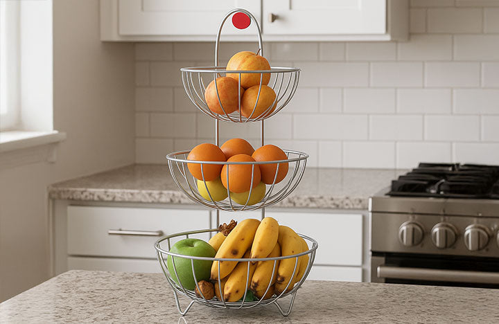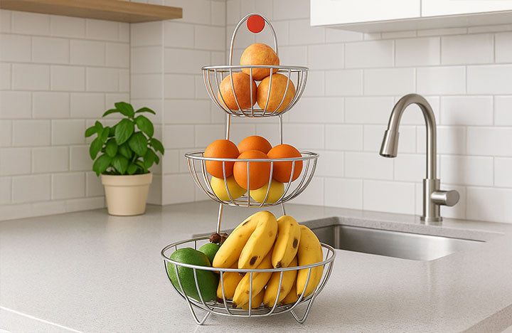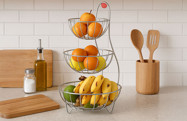 This 3-tier rack maximizes vertical space, allowing you to neatly store and organize fruits, vegetables, snacks, or bread in one compact, elegant unit—perfect for countertops or dining tables.