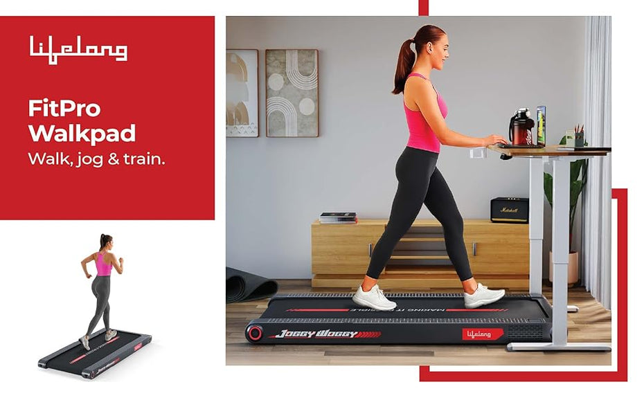 The Lifelong Walking Pad Treadmill features a 4 HP peak motor with 3-in-1 functionality for walking, jogging and vibration massage. It comes with 4 vibration modes, an LED display to track speed, time, distance and calories, a slim space-saving design, and supports up to 120 kg for home workouts.